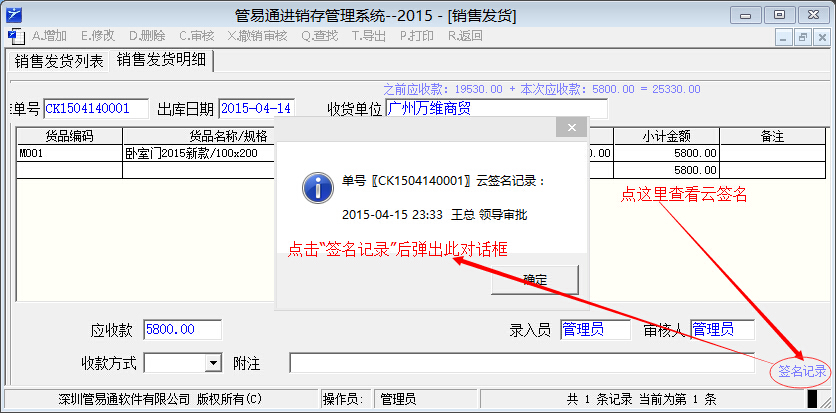 在管易通软件中,打印输出的入库单、出库单、销售单、送货单纸质单据上,同时打印一枚二维码,使用微信扫描二维码,即可实现云签名。